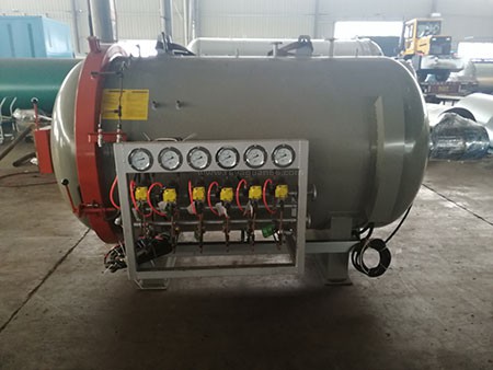 在工作的過程中罐內(nèi)會有抽真空的步驟,一般來講該設備都是多路抽真空的,罐外可以看到有著一排的真空表進行每一個管路進行抽真空,我們?yōu)榱俗寜毫_到我們想要的結果還要對罐內(nèi)進行加壓,壓力作用于制品上這樣就能更快的滲透和固化使得整個熱壓固化過程加速,一般來說現(xiàn)在的熱壓罐都是高壓熱壓罐。